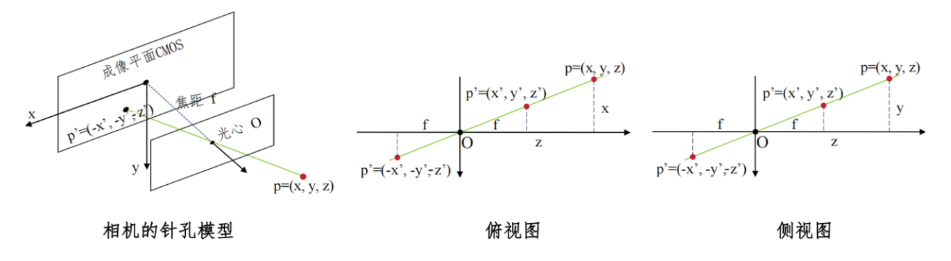 至此,我们已经了解了相机大概是如何运作的。但为了更好的描述,我们对各个参数进行一下的定义:镜头光心到成像平面的距离称为焦距,分辨率定义为图片的宽和高,像素尺寸的大小定义为。此外,为了便于理解,我们画出了这个成像模型的俯视图(沿着y轴正方向)和侧视图(沿着x轴负方向)。