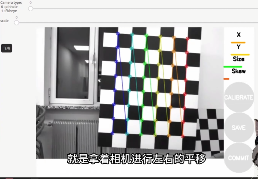 启动标定节点后,会弹出下面这个可视化界面。此时如果一切正常,那么标定板的角点上会出现一个一个特征点。可以看到右边又X、Y、size和skew四个进度条。